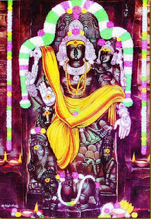 Another divine darshan is of Lord Dakshinamoorthy with His consort on the outer wall of the suyambu Valmikeeswarar shrine. He is seated with his left leg raised and bent, with His consort peeping from behind, holding on to His left hand and shoulder for support. Such a divine beauty! There was not much crowd today, and I was able to spend quite sometime absorbing the divine darshan. Worship of this special roopam of "Thambadya Dakshinamoorthy" is said to bestow one with all desires especially marriage wishes, reunion of couples, etc. And why not? This special divine darshan is a must-see, and so beautiful!